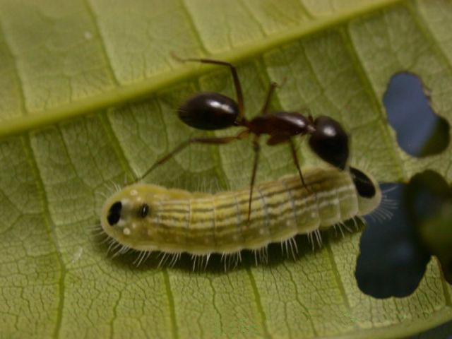 The lycaenid caterpillar works with ants; the ants provide protection, and the caterpillar helps provide food for the ant.