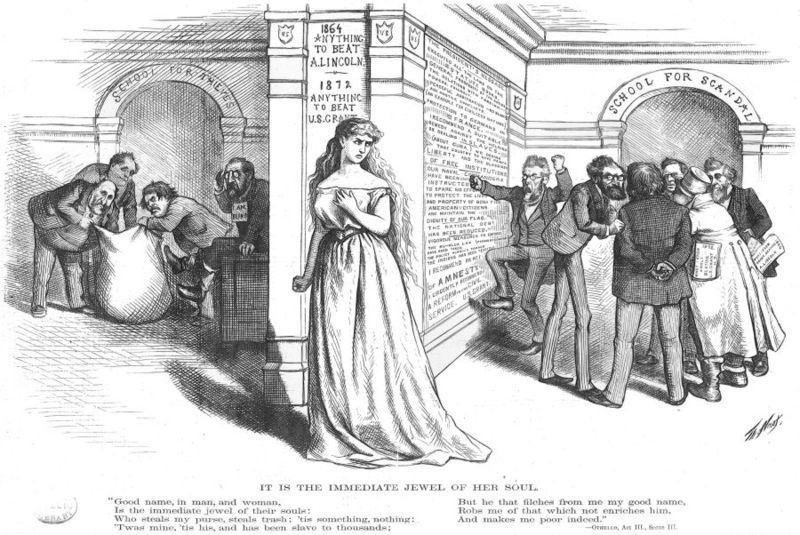 Columbia, between thieves and scandal (Nast cartoon, 1872)