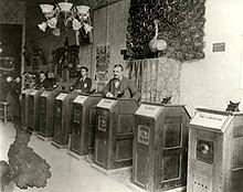 Shooting film is just the first part of the process; showing the movies to audiences is the second. The first approach was with the Kinetoscope (moving scope). The person watched the film, each machine being loaded with a particular movie, through a viewer on top. The number of movies a paying guest could watch was based on how much they paid.
