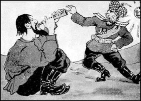 1916 cartoon showing Czar Nicholas II dancing to Rasputin's tune.